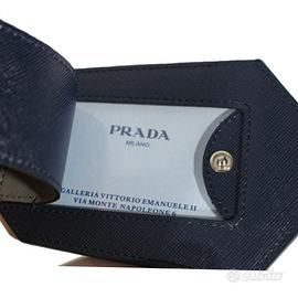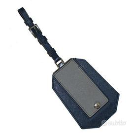 Porta etichette per valigia Prada in pelle blu scuro con chiusura a bottoncino automatico, e listelli di pelle per agganciarlo alla valigia.