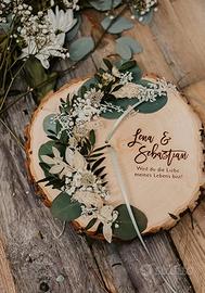 Originale porta fedi a forma di ciocco di legno, personalizzato con i nomi degli sposi e la data del matrimonio. Perfetto per custodire le fedi durante la cerimonia e diventare un ricordo unico e naturale del vostro giorno speciale.