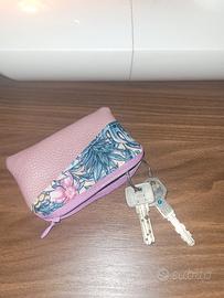 Realizzato in ecopelle di alta qualità e in un colorato tessuto floreale, offre spazio sufficiente per chiavi, carte, documenti d'identità o monete.