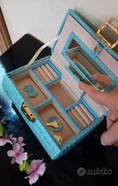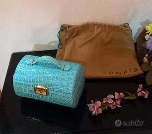 Borsetta capiente porta gioie anelli collane e altro più, tutto e come da foto e descrizione, nessuna rottura un micro puntino mancante di pellicina proprio sotto la base, non si nota rimane nascosto, roba del suo tempo e normale nulla di rilevante, e rimasta da sempre conservato nuovo senza cartellino ne scatola, ma nella sua sacca originale, colore sul turchese celestino, altezza totale partendo dalla maniglia circa 15/ 16/ cm./ larghezza 18/ cm./ nuovo inutilizzato ottimo stato di conservazione,possibilità di ritiro a mano, spese di spedizione da concordare, l'imballaggio sarà adattato e curato.😍