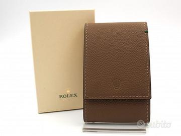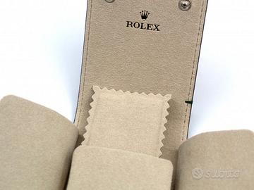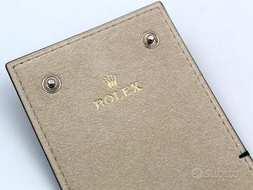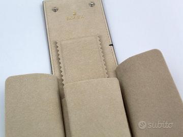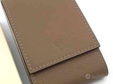 Porta Orologi Rolex Custodia Monoposto LOGO ESTERNO ROLEX Realizzato in Vera pelle Martellata Colore: Tortora Interno in pelle scamosciata antigraffio Beige Logo interno Oro Chiusura di sicurezza con doppio bottone applicato Cuciture in tinta Custodia morbida ideale per viaggiare e conservare gli orologi ORIGINALE ROLEX Misure: Altezza: 11 cm Larghezza: 7 cm Profondità: 2,5 cm