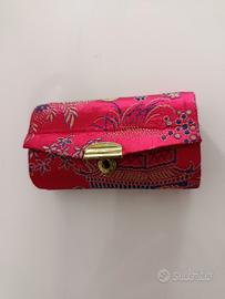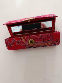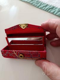Porta rossetto raffinato ed elegante in raso rosso e nero cinese si apre con bottone automatico e subito si vede lo specchietto . Un accessorio di vera sciccheria nuovo mai usato. Metto sempre un regalino nel pacco