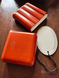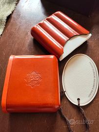 Porta sigari BOLDRINI selleria dal 1955 Firenze Made in Italy lavorazione artigianale fiorentina Nuovo e mai usato in Vera Pelle colore arancio e confezione in cartone rigido originale. Marchio sul fronte e retro del cappuccio, misura circa 8 cm x 7 x 3 mentre inserto circa 7 cm x 8 x 2. Può contenere 4 sigari. Tutto come da foto
