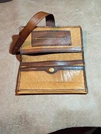 porta tabacco in pelle colore senape con inserti in cuoio,ha scomparti per tutto il necessario, NUOVO mai usato, fatto e cucito a mano, chiusura con fascetta di pelle.