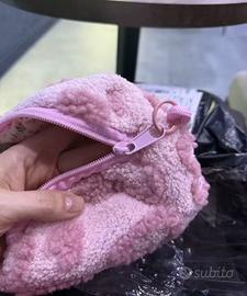 Porta trucchi rosa nuovo con cartellino, in morbido tessuto effetto teddy con motivo in rilievo.