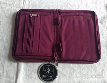 portablocco Samsonite per blocco più piccolo di un A5. In tessuto sintetico, chiusura con zip, dotato di varie tasche interne. Colore prugna. Nuovo mai usato in ottimo stato. Dimensioni in cm: 17x23