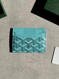 portacarte Goyard Saint Sulpice in tela spalmata Goyardine turchese (misto di cotone, lino e canapa) con dettagli in pelle di vitello. Caratteristiche: • Iconico design Saint Sulpice: compatto ma pratico, con diversi scomparti per carte e banconote. • Esclusivo motivo a chevron Goyardine. • Materiali resistenti e leggeri. • Condizioni: molto ben tenuto, senza macchie, strappi o difetti visibili. • Finiture tutte in ottime condizioni. • Misure: 9 x 12 x 1,5 cm: ideale per carte, banconote piegate e piccoli documenti. • Foto reali incluse, che mostrano tutti i dettagli e il caratteristico motivo Goyardine. Una scelta perfetta per chi cerca un lusso discreto e un pezzo da collezione senza tempo. Prezzo: 299€ (trattabili)
