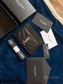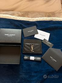 Porta carte in pelle nera con logo metallico argentato. È un modello molto sottile e funzionale, dotato di quattro fessure esterne e una tasca centrale. Esteticamente fa il suo effetto sempre molto elegante. Non è mai stato utilizzato.