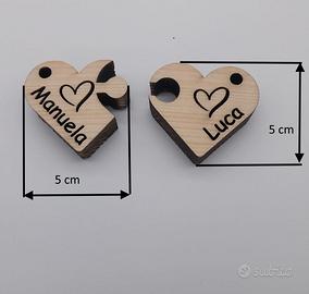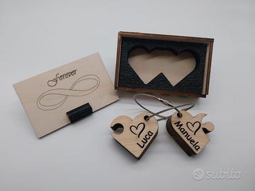 Questo portachiavi è composto da due cuori realizzati in legno incisi al laser.