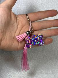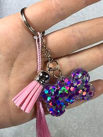 Portachiavi fatto a mano in resina epossidica, realizzato con stampo a forma di osso. Il design è arricchito da splendidi brillantini viola che creano un effetto luminoso e unico. 💜 Colore: viola con glitter 🦴Forma: Osso ✨ Dettagli: superficie lucida con effetto brillante 🔗 Accessori: due ciondoli decorativi che lo rendono ancora più originale 🖐️ Realizzato a mano – ogni pezzo è unico Perfetto come idea regalo o per personalizzare chiavi, zaini o borse con un tocco elegante e creativo. 📦 Condizioni: nuovo 🚚 Spedizione disponibile entro 24h