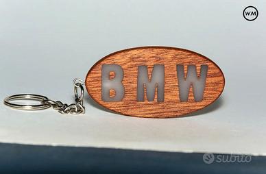 Portachiavi per auto/moto BMW realizzato interamente a mano in pregiato legno di mogano con caratteri in resina luminosa al buio.