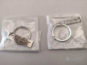 Vendo 5 portachiavi nuovi mai usati e ancora imbustati. Perfetti come idee regalo per sorella, migliore amica,fidanzata/o. Disponibili: 1 tondi "sorella"€8,00 l' uno. portachiavi in metallo con cabochon in vetro e scritta "Always my sister forever my friend." Ne ho due pezzi.Perfetti tra sorelle o amiche del cuore. 2 targhetta rettangolare incisa €7, 00l'una. targhette in metallo con frasi d'amore in inglese. Ne ho 3pezzi diversi.Ideali per partner o pensierino. OFFERTA SET COMPLETO:tutti e 5 a €32 invece di €37. Risparmi e hai regali pronti per più occasioni. Materiale:acciaio /lega ,resistenti e non anneriscono. anello standard tutti nuovi nelle bustine.