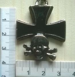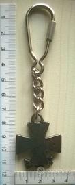 Portachiavi in metallo con croce e teschio, stile gotico.