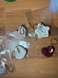Portachiavi realizzati a mano con fettuccia e impreziositi da un ciondolo a tema natalizio, perfetti come piccolo regalo o decorazione festiva.
