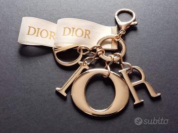 Portachiavi Dior, con lettere D I O R in metallo color oro, moschettone dorato, nastro in raso Dior color avorio