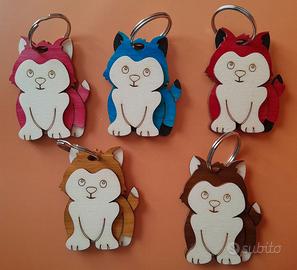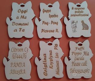 Realizzo con Laser oggetti di vario tipo che possono essere venduti a privati. Questi sono 2 proggetti che mi sono permesso di pubblicare: il primo, sono dei simpatici portachiavi gattino neutri o personalizzati. Il materiale è legno compensato incollato a 3 strati. I colori possono essere su Vs. richiesta oppure come vedesi in foto. Possono essere anche neutri cioè solo legno naturale.Il tipo di legno usato è betulla da 3 mm. L'anello portachiavi può essere da 28-30 mm in acciaio inox.