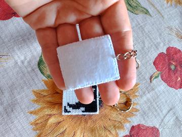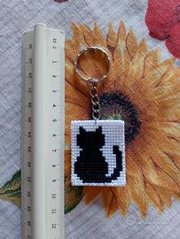 Un simpatico portachiavi con immagine del gatto nero, ricamato a punto croce su canva plastificata e rifinito dietro con feltro.