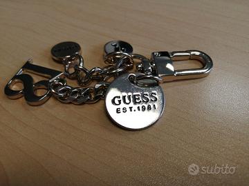 Portachiavi originale Guess, con moschettone, 4 ciondoli e catene in metallo, color oro. Non è mai stato usato.