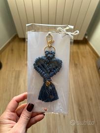 Portachiavi in macrame fatto a mano a forma di cuore color blu denim.
