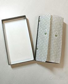 Il portachiavi è dotato di custodia rigida con zip, interno in tessuto verde trapuntato e ganci in metallo dorato per più chiavi.