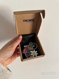 Portachiavi Ufficiale Oktoberfest München Questo elegante portachiavi (o ciondolo per borsa) è un pezzo da collezione ufficiale dell'Oktoberfest di Monaco, realizzato dal noto marchio tedesco TROIKA. 🔴Caratteristiche Principali • Brand: TROIKA (modello KR24-73/CH). • Materiali: Metallo pressofuso cromato a specchio, con rifiniture in smalto colorato. • Elementi del Charm: Il portachiavi presenta tre ciondoli iconici appesi a catenelle individuali: 1. Edelweiss (Stella Alpina): Il fiore simbolo delle Alpi, smaltato in bianco e giallo. 2. Dirndl: Il tipico abito tradizionale femminile bavarese, nei toni del rosso e rosa. 3. Lebkuchenherz (Cuore di Pan di Zenzero): Con la scritta "Spatzl" (tesoruccio), tipico dolce delle fiere tedesche. • Chiusura: Dotato sia di un anello brisé classico che di un pratico moschettone per agganciarlo facilmente a borse o zaini. • Particolarità: Sul retro dei ciondoli è presente l'incisione ufficiale "Oktoberfest". Dettagli Tecnici • Condizioni: Nuovo, nella sua confezione originale in cartone ecosostenibile. • Dimensioni confezione: Circa 10 \times 8 cm. 📏 • Design: Multicolore su base argento lucido.