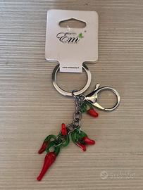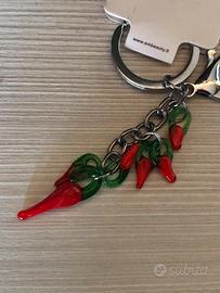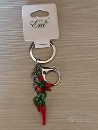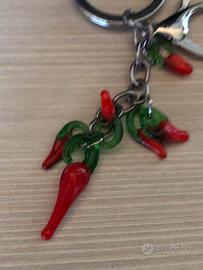 Bellissimo portachiavi con ciondoli a forma di peperoncino. I peperoncini sono realizzati in vetro di Murano e sono di colore rosso e verde. La catena e il moschettone sono in metallo argentato. Perfetto per aggiungere un tocco di colore e originalità alle tue chiavi!