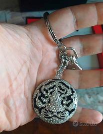 Elegante portachiavi RossoAmante da uomo in acciaio e fibra di carbonio con pietre. Il medaglione (che ritrae una tigre) può essere utilizzato anche come ciondolo di una collana.