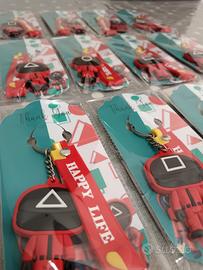 12 portachiavi squid game con cartoncino di ringraziamento e bustina.