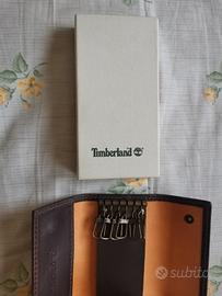 Portachiavi Timberland in pelle marrone esterna e senape/arancione interna.