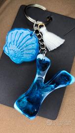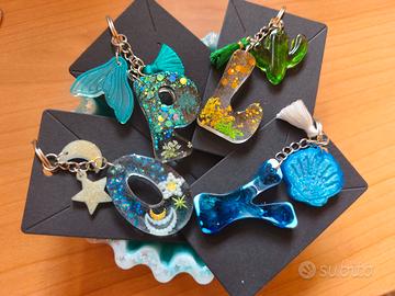 Portachiavi e ciondoli fatti a mano con lettere personalizzate, fiori essiccati, dettagli brillantinati e tante forme diverse: conchiglie, gatti, cactus, luna e stelle.