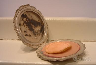 Scatola portacipria da borsa o da tavolo in argento cecoslovacco con punzonatura 244, privo di specchietto interno misura diametro 6,5 cm, vendo 15 euro.