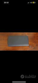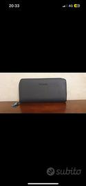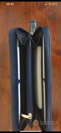 Di pelle effetto saffiano con logo centrale della marca, di colore blu. Zip tono su tono e cerniera lampo dorata (con ancora la pellicola attaccata).