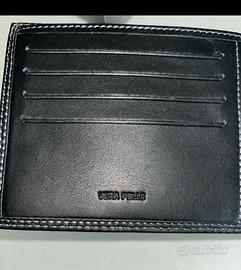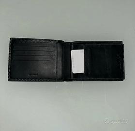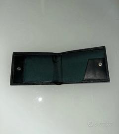 Portafogli con porta assegni, porta tessere e due comparti per le banconote; nuovo mai usato il tutto nella sua scatola originale. Il portafoglio è di vera pelle colore nero