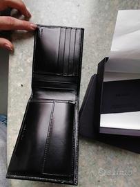 scomparto per banconote, fessure per carte, portamonete, dettaglio interno a contrasto, e scritta logo in metallo color argento sul fondo.