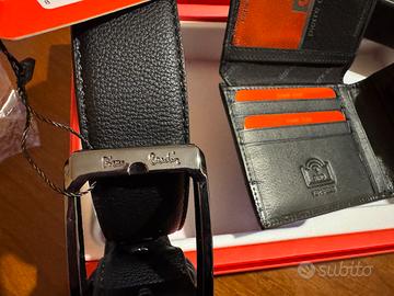 Confezione regalo contenente portafoglio in pelle e cintura in pelle Pierre Cardin mai usati, ancora con etichette, perfetta per un gradito regalo.