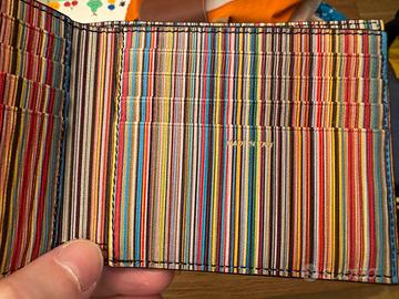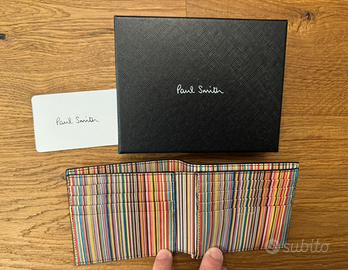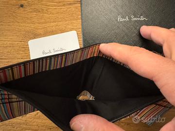 Vendo portafogli Paul Smith da uomo modello “Black Leather 'Signature Stripe' Interior Billfold Wallet”, in pelle nera, made in Italy. Il portafogli è nuovo con cartellino. Ha 10 scomparti per le tessere, non ha il taschino portamonete. Lo vendo causa inutilizzo. Comprato sul sito di Paul Smith, come si puó vedere nell’ultima foto, costa 220€.