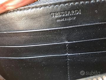 Portafogli da donna in pelle. Marca Trussardi, colore nero fantasia con logo. Made in Italy.
