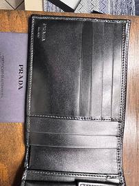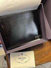 Portafogli da uomo Prada, in pelle nera. scomparto per banconote, fessure per carte, portamonete, dettaglio interno a contrasto, e scritta logo in metallo color argento sul fondo. DOTATO DI CERTIFICATO DI AUTENTICITÀ L'oggetto è nuovo mai usato. Ritiro in persona a San Giorgio di Piano, BO No spedizione. X INFO SCRIVIMI