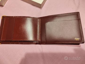 Si tratta di un portafoglio Must de Cartier. Realizzato in pelle di vitello color bordeaux con finiture color oro, presenta il caratteristico logo della Maison impresso al centro e angoli in metallo dorato.