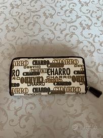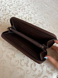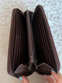 Portafoglio beige e marrone con scomparti. Usato ma ben conservato.