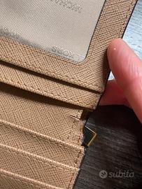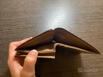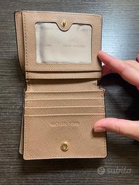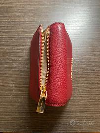 Vendo portafoglio compatto Michael Kors in pelle martellata color ciliegia con logo e dettagli color oro. Modello dotato di scomparto banconote, portamonete e diverse spazi per le carte. Utilizzato, ma in buone condizioni. Sono presenti alcuni segni di usura come da foto.