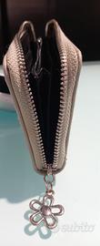 portafoglio grigio con cerniera e ciondolo a forma di margherita in similpelle. 2 scomparti divisi e tasca con zip per le monete.