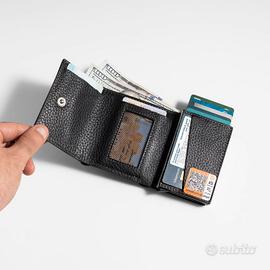 Portafoglio trifold da uomo, nero elegante e tecnologico.