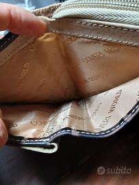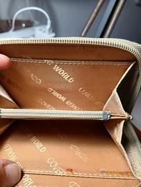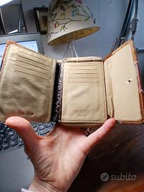 Portafoglio/portamonete vintage Coveri World in pelle ( sia esternamente che internamente), dimensioni 13,5 cm x 10,5 cm. Ha diversi scomparti. Mai utilizzato. Vicino al portamonete la fodera è leggermente macchiata in alto. ( vedi ultima foto).