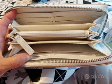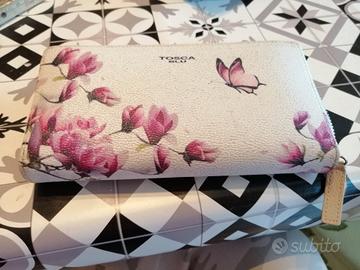 Portafoglio da donna originale Tosca Blu, vintage. Presenti 8 vani portatessere, diversi scomparti per le banconote ed uno scomparto con chiusura lampo per le monete, il tutto in soli 4 cm di spessore. È usato ma ancora in buone condizioni, solo il colore non è più bianco splendente.