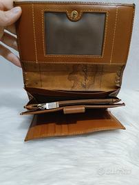 Bellissimo portafoglio da donna firmato Alviero Martini 1° Classe. Chiusura con bottone a pressione. Presenta tasche per documenti, porta foto, porta monete… ‼️Ai lati ci sono dei piccoli difetti, visibili in foto!