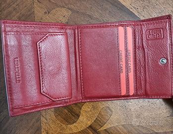 E 1 portafoglio piccolo dotato di protezione RFID, in vera pelle, rosso scuro.