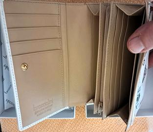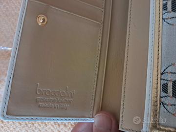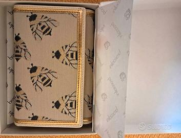 Braccialini portafoglio donna in pelle e canvas, a tema api, con numerosi scomparti per tessere e banconote e taschina per monete dotata di cerniera; genuine leather. Nuovo, ancora nella scatola originale