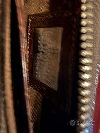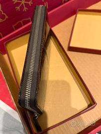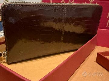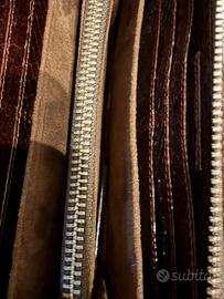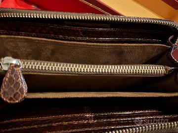 Portafoglio donna grande, elegante con chiusura zip. Marca Sabrina. Mancante di cartellino, ma nuovo, mai utilizzato. Diversi scompartimenti per carte, documenti e portamonete. Colore marrone lucido esternamente con trama pitone
