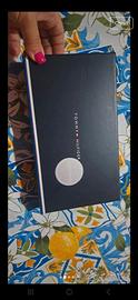 Utilizzato 1 volta ancora con scatolo originale e busta protettiva, materiale pelle colore rosso corallo,marchio e cerniera esterna oro, dentro come si può vedere e blu scuro con stemma e cerniera oro, porta carte ad entrambi i lati non ha danni solo il marchio un po graffiato come si vede in foto, pagato 150.00€ prezzo poco trattabile